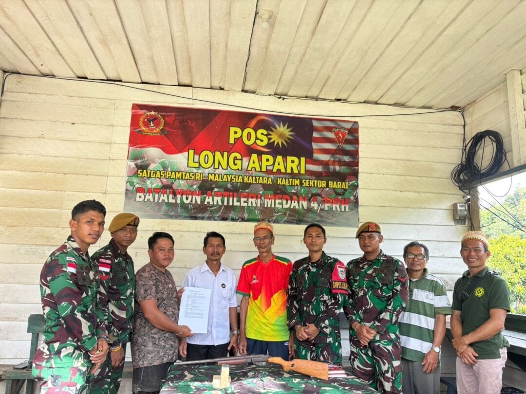 Headlineterkini.id, Long Apari, Mahakam Ulu.-Kepercayaan masyarakat terhadap kehadiran Satgas Pamtas RI–Malaysia Sektor Barat Yonarmed 4/Parahyangan Kodam 3 Siliwangi yang dipimpin Letkol Arm Januar Idrus,S.H,M.I.P semakin menguat. Bukti nyata terlihat saat seorang warga Kampung Long Apari, Kabupaten Mahakam Ulu, dengan penuh kesadaran menyerahkan satu pucuk senjata api rakitan jenis Col kaliber 9 mm kepada Pos Long Apari Satgas Pamtas Yonarmed 4/Parahyangan, Selasa (21/10/2025).